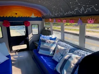 Our fun bus can comfortably accomodate 12 people, including seatbelts for carseats.